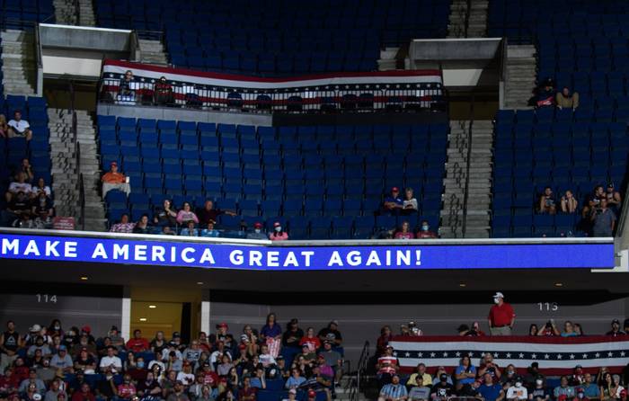 다급해진 트럼프 캠프는 코로나19로 인해 중단했던 유세를 재개했다. 주정부의 반대를 무릅쓰고 6월 20일 재개한 오클라호마주 실내체육관 BOK센터 선거유세는 흥행 참패를 기록했다. 트럼프 대통령은 “거의 100만 명이 유세 참가 티켓을 신청했다”고 트윗을 날렸고, 선거캠프 측도 약 10만 명 정도 몰려들 것으로 예측하고 야외 유세를 계획했다. 하지만 정작 유세는 2만 명 규모의 유세장을 채우지 못했고 특히 2층 자리 대부분은 비어있었다. 지역 소방서는 6100명이 참석했다고 전했다. 뉴욕타임스는 K팝 팬들이 유세 입장권 수만 장을 신청해놓고 유세장에 나타나지 않는 방식으로 보이콧 운동을 했다고 분석했다. 설상가상 유세 후 잠복기를 지나 유세지역의 코로나19 확진자가 급증하였다. 유세장에서는 대부분 마스크를 쓰지 않았다.