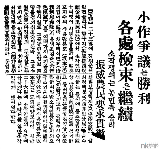 농민들이 벌이는 투쟁을 소작쟁의라고 했다. 황구지리 소작쟁의 관련 기사. (1931년) 일제 강점기 당시 소작쟁의가 활발히 일어났다.