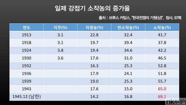 3%에 불과한 지주가 전체 경작지의 절반을 차지하는 극단적 불균등한 토지소유관계가 일제 강점기 형성된 것이다.
