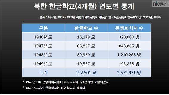 즉, 1949년 38선 이북지역 성인들 모두가 우리말을 읽고 쓸 수 있게 된 것이다.