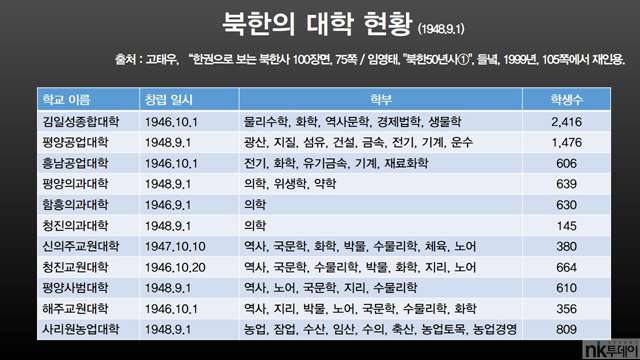 이렇게 하여 출범한 김일성종합대학은 7개 학부 24개 학과 중 문학부, 법학부를 제외하고 모두 이공계였다.