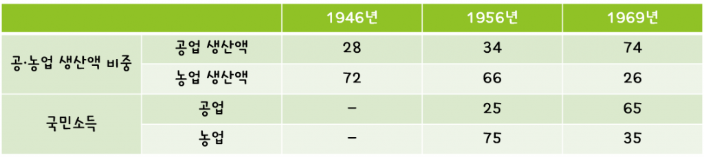 ● 공·농업 총생산액 및 국민소득에서 차지하는 공업과 농업의 비중(%)