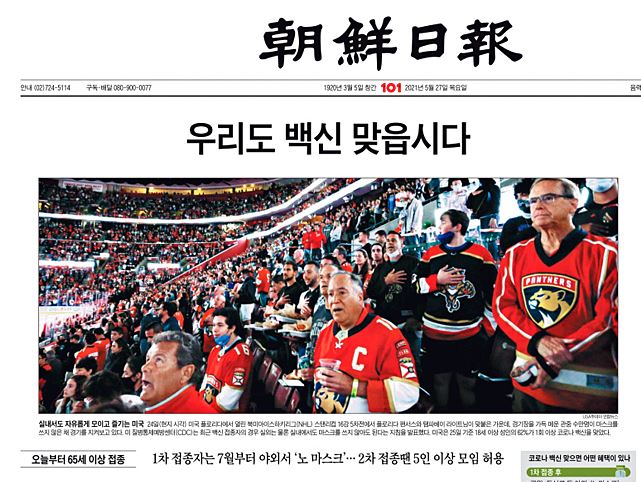 그런데 조선일보가 5월 21일 한미정상회담 이후 확 달라졌다. 조선일보는 5월 27일 1면 머리기사로 <우리도 백신 맞읍시다>라는 기사를 대문짝만하게 내보냈다. 그 외에도 <60세 이상 백신 1차만 맞아도, 감염 예방 90% 사망 예방 100%>라는 보도를 내보냈다.