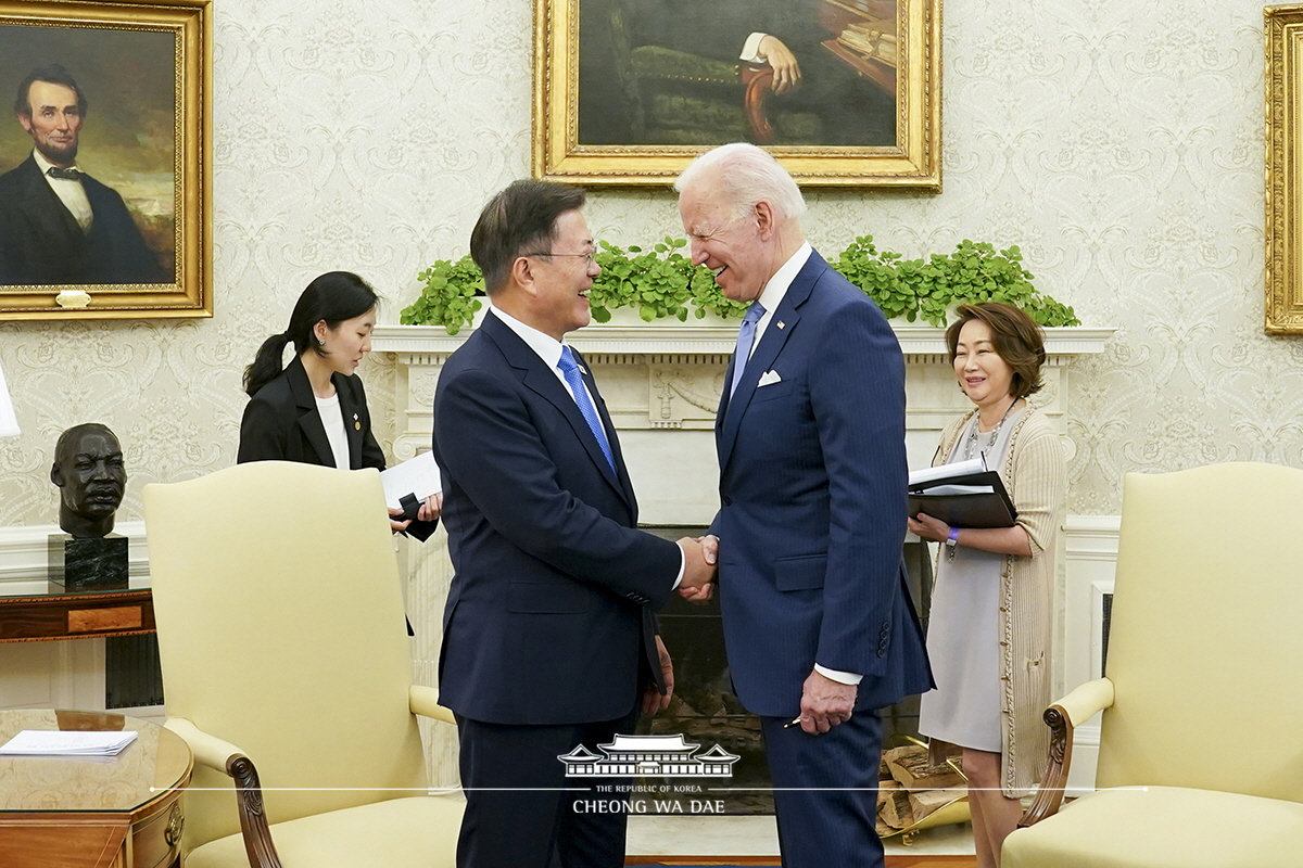 바이든 대통령과 문재인 대통령이 한국전 참전용사 명예훈장 수여식에 함께 참석한 것도 화제가 됐다. 바이든 대통령이 제안해 함께 사진을 찍기도 했다. 문재인 대통령은 “최고의 순간, 최고의 회담”이라고 평했다.