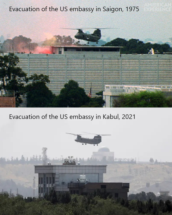 미국은 헬기를 동원해 미국 대사관에 있는 사람들을 대피시키기도 했다. 이 장면은 베트남전을 연상시켰다. 1975년 미국은 베트남전에서 패배한 후 헬기를 동원해 사이공에 있는 대사관에서 사람들을 탈출시켰다. 이 사진은 베트남전을 상징하는 사진 중 하나가 되었다. 그런데 이 장면이 2021년 아프간에서 재현되었다.