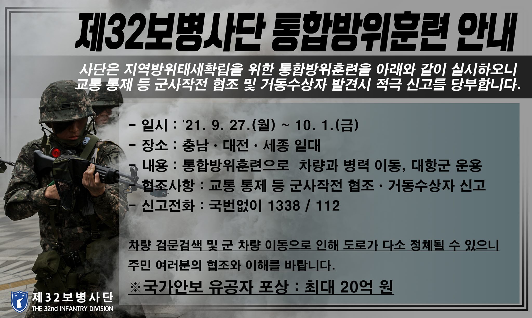 최근 국가보안법의 무서움을 보여주는 단적인 사례가 있다. 대전에 있는 제32보병사단에서는 지난 9월 27일부터 10월 1일까지 통합방위훈련을 벌였다. 사단에서는 최대 20억 원 포상을 내걸며 “거동수상자 발견 시 적극 신고”를 당부했다. 한마디로 군 당국에서 철 지난 간첩 신고를 부추긴 것이다. 서로가 서로를 간첩으로 의심케 만드는 박정희-전두환식 종북몰이 수법이다. 실행자들의 인식이 얼마나 국민과 동떨어져 있는지 드러나는 장면이다.