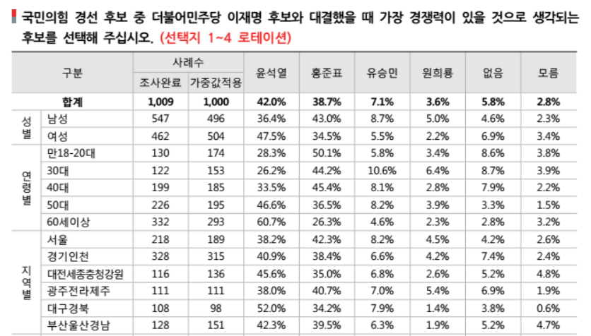 지역별로 보면 광주·전라·제주 지역에서 홍준표 41%, 윤석열 38%로 홍준표 후보가 승리했다. 서울에서도 홍준표 42%, 윤석열 38%로 홍준표 후보가 앞섰다.