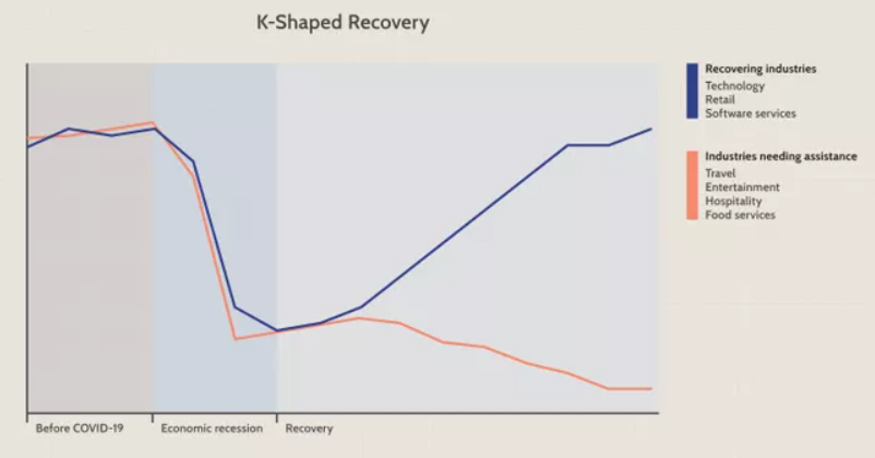 크레디트 스위스 리서치가 발간한 ‘2021 글로벌 자산보고서’에 따르면 2020년 한 해 동안 극빈층이 8,000만 명 이상 늘었는데 대신 백만장자가 520만 명 증가했다고 한다. 코로나19로 부자는 더욱 부자가 되고, 가난한 사람은 더욱 가난해지는 현상을 두고 K자형 경제회복이 이뤄지고 있다고 일컫는다.
