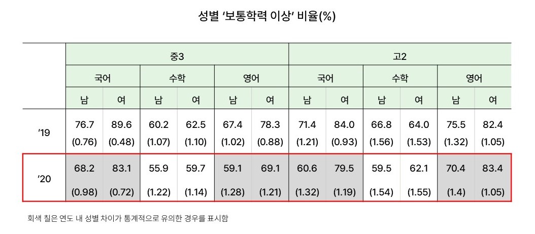 반면 중학교 3학년 학생 중 기초학력 미달의 학업성취도를 보인 비율은 국어에서 남성 10%, 여성 3%, 수학에서 남성 16%, 여성 11%, 영어에서 남성 10%, 여성 4%였다.
