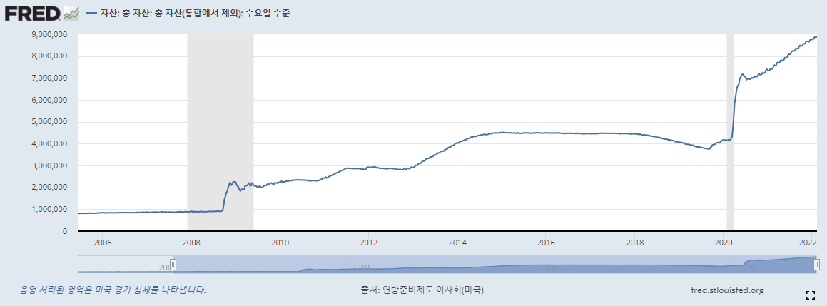 사실 미국 경제는 코로나 사태 이전에 이미 파국을 맞을 상황이었다. 2008년 미국 부동산거품이 꺼지면서 당시 세계 네 번째 투자은행인 리먼 브라더스가 약 700조 원의 부채를 감당하지 못하고 파산한 것을 시작으로 세계 금융위기가 터졌다. 미국은 이 위기를 극복하기 위해 2008년부터 2014년까지 4조 5천억 달러를 풀었다. 그 부작용이 터지려는 찰나, 2020년 코로나 사태가 터졌고 미국은 4조 달러를 추가로 공급했다.