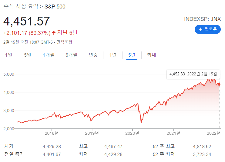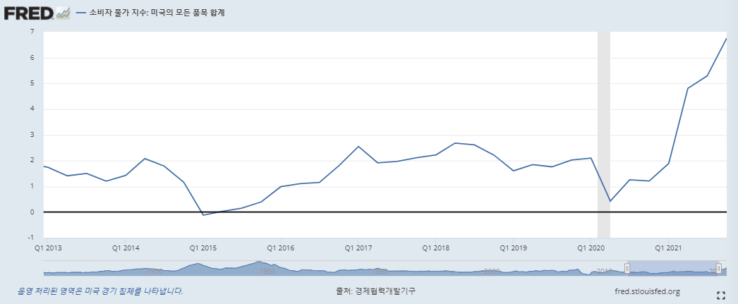 올해 1월 미국의 소비자물가지수는 작년 1월 대비 7.5% 상승했다. 1982년 이후 최대폭이다. 2020년 물가상승분이 2015년에서 2019년까지 5년 동안의 물가상승분과 맞먹는다.