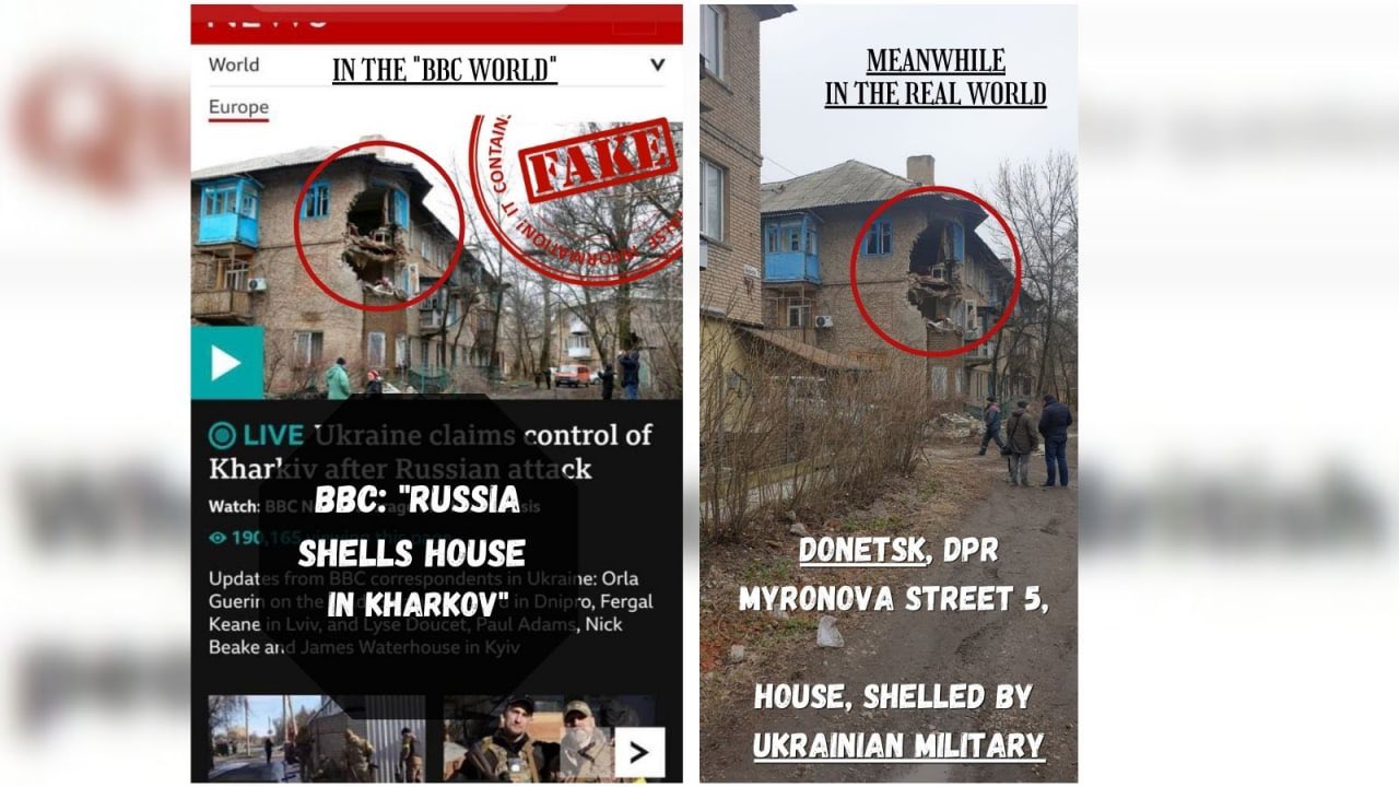영국 BBC는 러시아가 우크라이나 제2의 도시 하르키우를 폭격해 민가를 부쉈다며 사진과 함께 보도했다. 러시아 국방부는 이 집은 우크라이나에서 분리독립하려는 도네츠크 지역에 있는 집이며, 이 집을 폭격한 건 우크라이나군이라고 반박했다. 러시아 국방부는 집주소까지 자세히 공개했는데, 구글 지도로 확인하면 그 주소가 맞는다는 걸 확인할 수 있다.