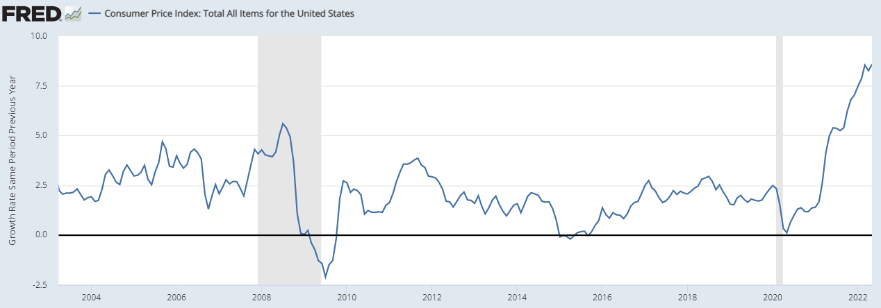 미국의 물가상승률은 2008년 이후로 5%를 넘은 적이 없고 대부분 2.5%를 밑돌았다. 그러던 물가가 2021년 치솟기 시작해 현재 8.6%까지 뛰었다.