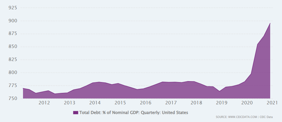 이런 정책에 따라 미국의 빚이 늘어났다. 미국의 가계+정부+기업 부채*는 2020년 1월 미국 GDP 대비 747%에서 2021년 3월 856%까지 늘어났다. 1년 만에 미국 GDP만큼의 빚이 늘어난 것이다.