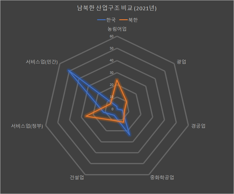 남북 산업구조 비교. 북한에 비해 한국은 민간 서비스업과 중화학공업에 지나치게 편중된 산업구조로 되어 있다. [자료 출처 - 통계청]