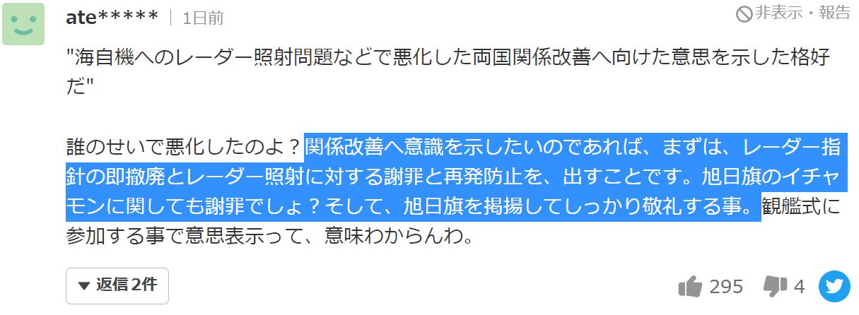 누리꾼 ㄹ 씨는 “관계개선 의욕을 밝혔으면 먼저 레이더 지침을 즉시 폐지하고 사죄와 재발 방지를 해야 한다. 욱일기에 관해 이러쿵저러쿵한 것도 사죄해야 한다. (한국 해군은) 욱일기를 게양하고 제대로 경례해야 할 것이다. 관함식에 참가하는 의사 표시를 밝히란 말이다”라고 주장했다.