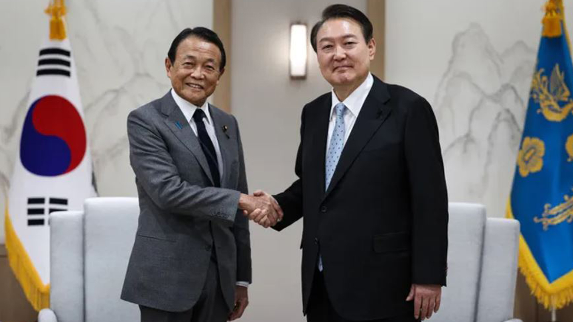 아소 부총재는 한국에 온 당일 용산 대통령실 청사를 곧바로 찾아 윤 대통령을 만났다. 기시다 총리에게 한일 정상회담을 구걸했지만 거부당해 굴욕만 자초한 윤 대통령이, 총리도 아닌 2인자에게 깍듯하게 예의를 갖춘 모양새다.
