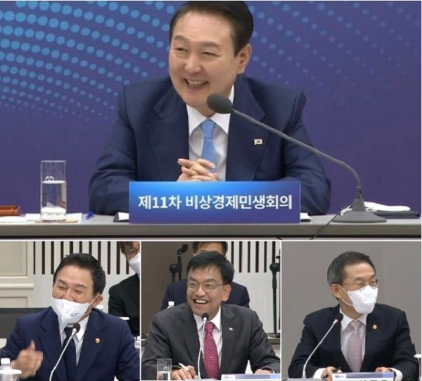 이런 와중에 정부가 보이는 행태는 한심한 수준이다. 일단 레고랜드 사태를 일으킨 김 지사는 문제가 눈덩이처럼 커지자 베트남으로 해외 출장을 가버렸다. 윤석열 대통령은 민생 문제가 심각하다며 10월 27일 비상경제민생회의라는 것을 생중계로 내보내면서 시종일관 화기애애한 분위기에서 농담과 웃음꽃으로 일관해 과연 서민경제에 관한 관심이라도 있는지 의문을 자아냈다. 경제전문가 채이배 전 의원은 10월 28일 SBS 라디오 ‘김태현의 정치쇼’에 출연해 “물에 빠진 국민들이 허우적거리고 있는데 장관과 대통령이 옆에서 한가로이 뱃놀이 하고 있는, 전혀 ‘비상’하지 않은 비상경제민생회의였다”라고 꼬집었다.