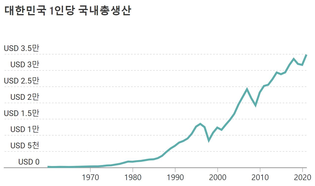 위의 한국 1인당 국내총생산 그래프를 보면 세 차례 떨어지는 부분이 보인다. 바로 1997년 IMF 사태, 2008년 세계 금융위기 사태, 최근 코로나19 사태 때문에 발생한 마이너스 성장이다. IMF 사태 때도, 세계 금융위기 사태 때도 한국 경제는 힘들었지만 1, 2년 정도 지나서 다시 회복하였다.