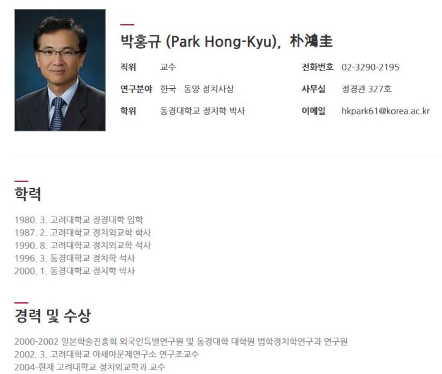 먼저 공개된 이력을 살펴보면 박 교수는 ‘일본학술진흥회 외국인특별연구원’ 자격으로 일본 측의 지원을 받아 도쿄대에서 석·박사를 마친 일본 유학파다. 일본에서 유학을 마친 박 교수는 2004년부터 지금까지 고려대 정치학과 교수로 재직하고 있다.