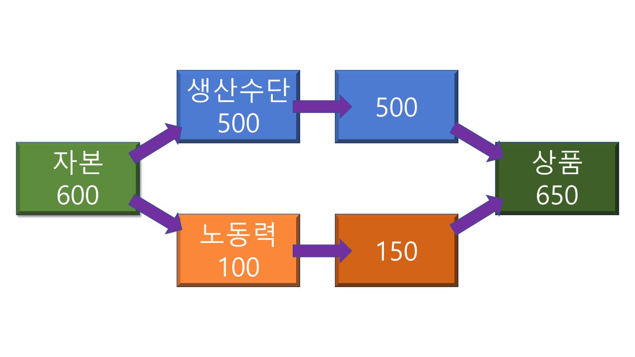 그래서 빵의 가치가 650원이 되며 자본가는 투자한 원금 600원을 제외한 50원을 잉여가치로 차지한다.