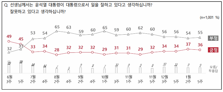 그런데 이 흐름이 한 달도 못 가서 꺾이고 말았다. 북한 무인기 사건(12월 26일)이 터진 것이다. 북한 무인기가 날아왔는데 제대로 대응도 못하고 개 사진이나 공개하는 황당한 행동을 하니 지지율이 떨어졌다. 그리고 해가 바뀌고 여파가 가라앉을 무렵 애초 정부 발표와 달리 용산 대통령 집무실 상공 비행금지구역에 북한 무인기가 들어왔었다는 사실이 드러나면서(1월 5일) 다시 논란이 커졌다.