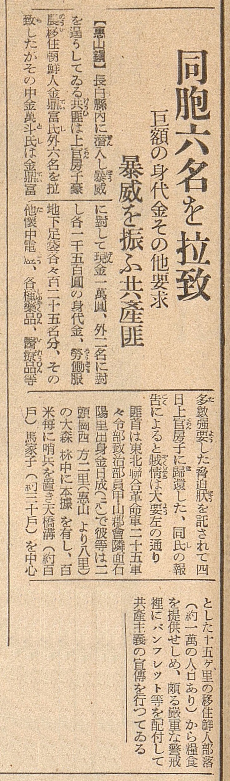 “장백현 내에 잠입해 폭위를 벌이고 있는 비적은 상관 방자 호농(대지주)인 이주 조선인 김정부 씨 외 6명을 납치했지만 그중 김만두 씨는 김정부 씨에 대해 현금 1만 엔, 다른 2명에 대해 각 현상금 1,500엔, 노동복·작업화 각각 125명분, 그 밖에 회중전등, 각종 약품, 의료품 등 다수를 강요한 협박장을 부탁받아 4일 상관 방자에 귀환했다. 김만두 씨의 보고에 따르면 적정은 대강 왼쪽에 적은 대로, 비적 수장은 동북연합혁명군 25군 사령부 정치부원 갑산군 회린면 석양리 출신 김일성(28)이며 그들은 2두강 서쪽 2리(혜산에서 8리)에 있는 큰 숲 안에 본거지가 있으며 100미터마다 초병을 두고 천교강(약 100호), 마가자(약 300호)를 중심으로 한 15여 리의 이주 조선인 부락(인구 약 1만 명)에 교묘하게 식량을 제공하고, 대단히 엄중한 경계 속에 팸플릿 등을 배부하며 공산주의 선전을 하고 있다.” (「동포 6명을 납치」, 경성일보, 1936.9.11.)