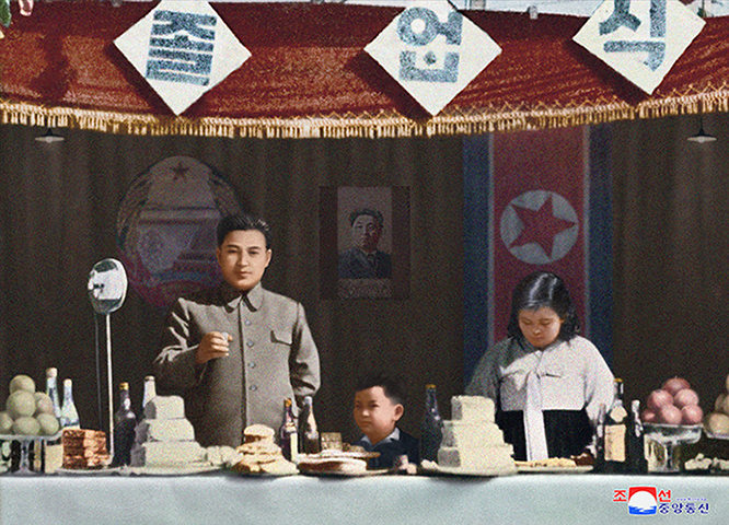 1948년 10월 14일 제1중앙군관학교 제2기 졸업식에 참석한 김일성 주석과 김정일 국방위원장, 김정숙 여사.