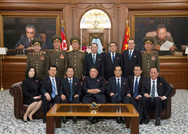 2019년 4월 11~12일 최고인민회의 이후 김정은 국무위원장이 국무위원회 성원과 찍은 기념사진. 앞줄 왼쪽 첫 번째가 최선희 외무상.