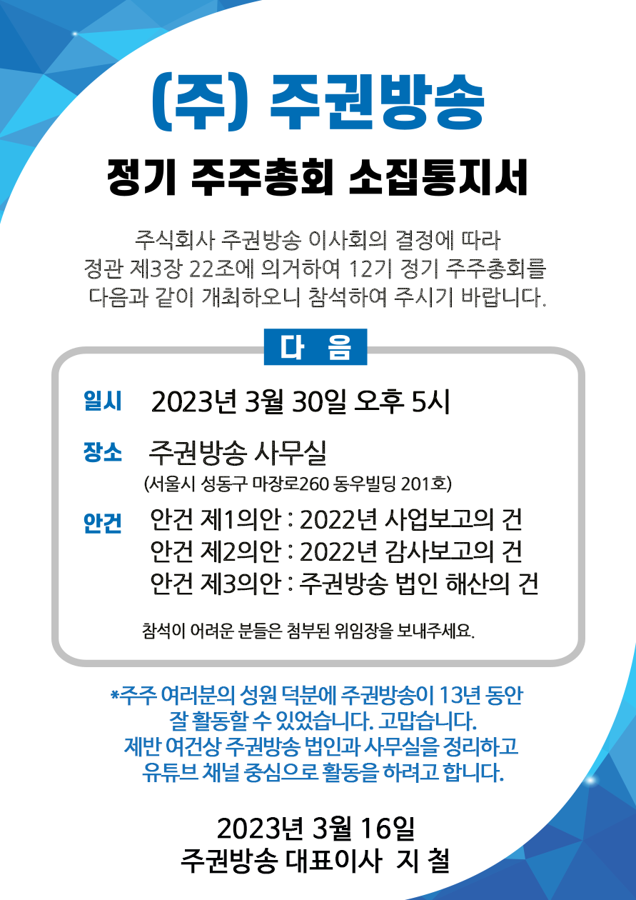 카테고리 없음 2023. 3. 16. 2023년 12기 정기주주총회 글자 작게 글자 크게 인쇄 공유 닫기 이 기사를 공유합니다. 카카오스토리 페이스북 네이버블로그 트위터 링크복사 기사 작성 : 2023년 03월 16일 기사 제목 : 2023년 12기 정기주주총회 주식회사 주권방송 이사회의 결정에 따라 정관 제3장 22조에 의거하여 12기 정기 주주총회를 다음과 같이 개최하오니 참석하여 주시기 바랍니다. 주주총회_위임장.hwp 0.03MB 공유하기 게시글 관리 주권연구소 Copyright 2010- 주권연구소. 무단전재 및 재배포 금지