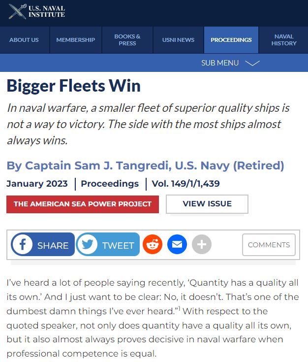 2022년 11월 미 국방부의 「2022년 중국 군사력 보고서」에 따르면 중국 해군은 전함 수에서 2020년쯤 미 해군을 앞질렀다고 한다. 미군은 자국 전함의 기술 수준이 더 높다고 평가하지만 샘 탕그레디 미 해군전쟁대학 교수는 중국이 미국에 거의 버금가는 군사 기술력을 가졌고 인공지능의 군사적 응용에서 선두 주자라고 평가했다. 또한 “육전과 해전은 다르다”라며 해전은 수적으로 우세한 쪽이 절대적으로 유리하다고 주장했다. (Sam J. Tangredi, 「Bigger Fleets Win(전함이 많은 쪽이 이긴다)」, 『Proceedings』 2023년 1월호, 미 해군연구소, 2023.)