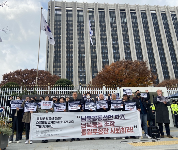 6.15공동선언실천 남측위원회 등 160개 시민사회 단체가 지난해 11월 15일 오전 11시 통일부 앞에서 기자회견을 열고 권영세 통일부 장관의 즉각 사퇴를 요구했다. [사진제공-6.15남측위]