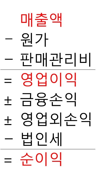 여기서 매출액은 기업 활동으로 벌어들인 총수익, 영업이익은 매출액에서 원가와 판매관리비(인건비, 연구개발비, 광고비 등) 등을 빼고 영업활동으로 순수하게 남은 이익, 순이익은 영업이익에서 금융손익·영업외손익(부동산 매매 등)·법인세 등을 반영한 것이다. 이 가운데 기업의 본업으로 생기는 이익인 영업이익은 기업의 장기적인 수익력을 나타내는 중요한 지표다.