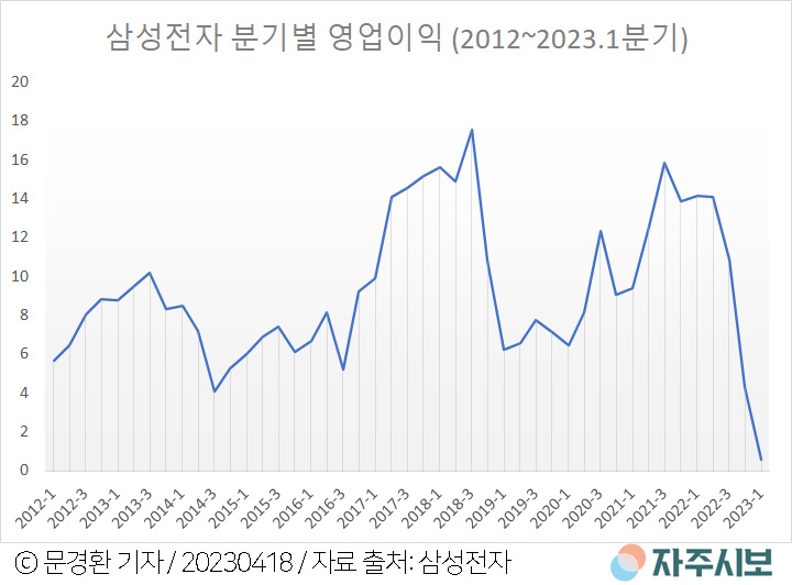 삼성전자 분기별 영업이익은 더 처참하다. 2022년 4분기 영업이익은 4조 3,061억 원으로 전년 동기보다 69.0%나 떨어졌으며 분기 영업이익이 4조 원 대에 머문 것은 2014년 3분기 이후 8년여 만이다. 나아가 2023년 1분기 영업이익은 6천억 원으로 완전히 폭락했다. 분기 영업이익이 1조 원 밑으로 떨어진 것은 14년 만이다.
