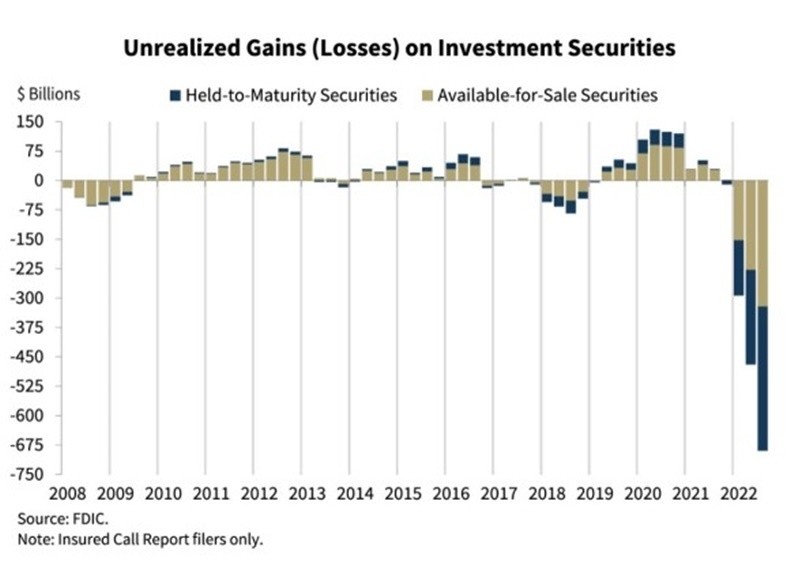 그런데 미국 금리가 가파르게 오르면서 미국채 가격은 반대로 가파르게 떨어졌다. 그리고 각 은행에 예금 대량 인출 사태가 발생하자 은행은 고객의 예금을 돌려주기 위해 자산을 팔아치워야 하는 상황이 됐다. 그래서 미국채를 팔려고 보니 가격이 내려가 있다. 물론 만기까지 기다리면 제값을 받겠지만 당장 팔아야 하는 상황이라 울며 겨자 먹기로 손실을 보면서 팔아야 했다. 실리콘밸리 은행 파산 과정에서 이 은행이 보유한 대부분의 손실 자산은 미국채였음이 드러났다.