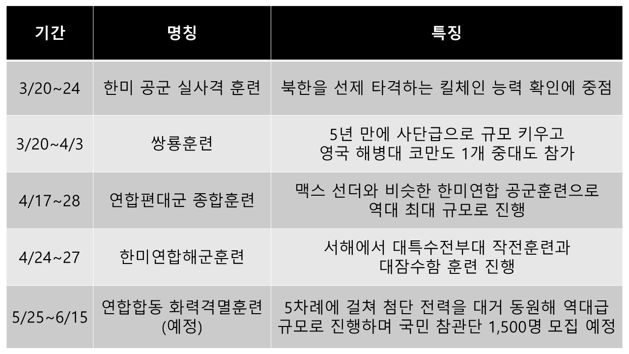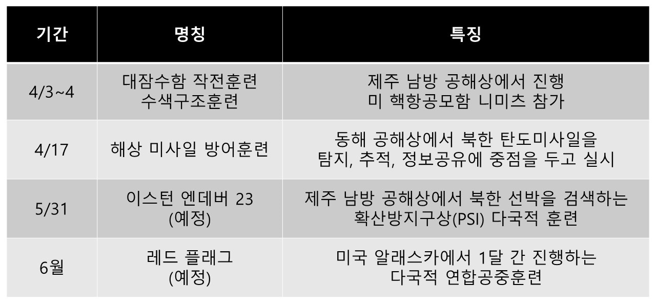 최근 한·미·일은 실전을 방불케 하는 각종 훈련을 쉴 새 없이 강도 높게 진행하고 있다. 3월에 있었던 한미연합훈련 ‘자유의 방패’ 이후에 있었던 훈련들과 실시할 예정인 훈련을 꼽아보면 다음과 같다.