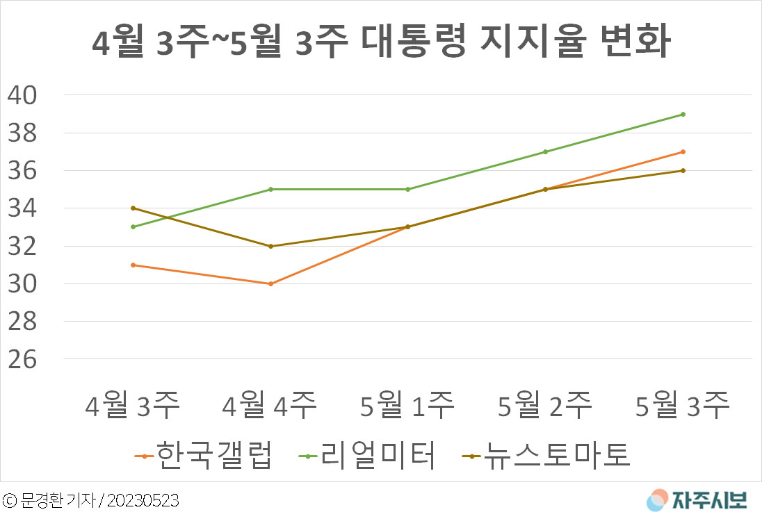 지난 4월 26일(현지 시각) 미국에서 열린 한미정상회담 이후 윤석열 대통령 지지율이 꾸준히 오르고 있다. 물론 그래도 40%를 넘지 못해 매우 낮은 편이지만 4주 연속 상승한 점은 우연이라고 보고 넘길 수 없다.