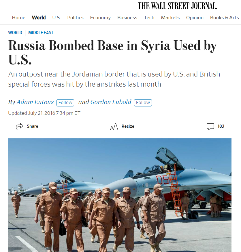 2016년 6월 16일에는 미군 특수부대가 사용하는 시리아 반군 비밀기지를 러시아가 폭격하는 사건도 있었다. 폭격을 받은 미군은 러시아 측에 공격 중단을 요구했지만 러시아는 90분 후 비밀기지를 다시 폭격했다. 그런데 미국은 사태의 확산을 막기 위해 이 사건을 문제 삼지 않기로 했다.