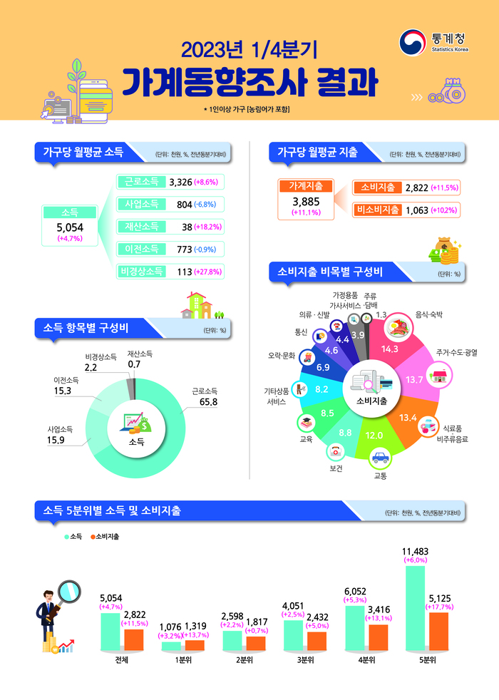 통계청이 2023년 5월 25일 발표한 「2023년 1분기 가계동향조사」에서도 이로 인한 빈부격차가 고스란히 드러난다. 올해 1분기 가구당 월평균 소득은 505만 4,000원으로 작년 1분기보다 4.7% 늘어났다. 하지만 물가 상승 영향으로 실질소득 상승률은 0%에 그쳤다.