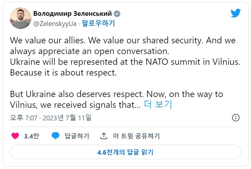 그런데 나토 공동선언문 초안에는 “가입 조건을 충족하고 동맹국이 동의하면 우크라이나에 가입 초청을 하기로 합의했다”라는 문구만 있고 구체적인 가입 일정이 명시되지 않았다. 이를 확인한 젤렌스키 대통령은 공식 일정도 시작하기 전에 자신의 트위터에 “터무니없다”, “나약하다”라며 나토를 비난했다. 언제까지 가입시켜 줄지 시간을 확정하라는 것이다.