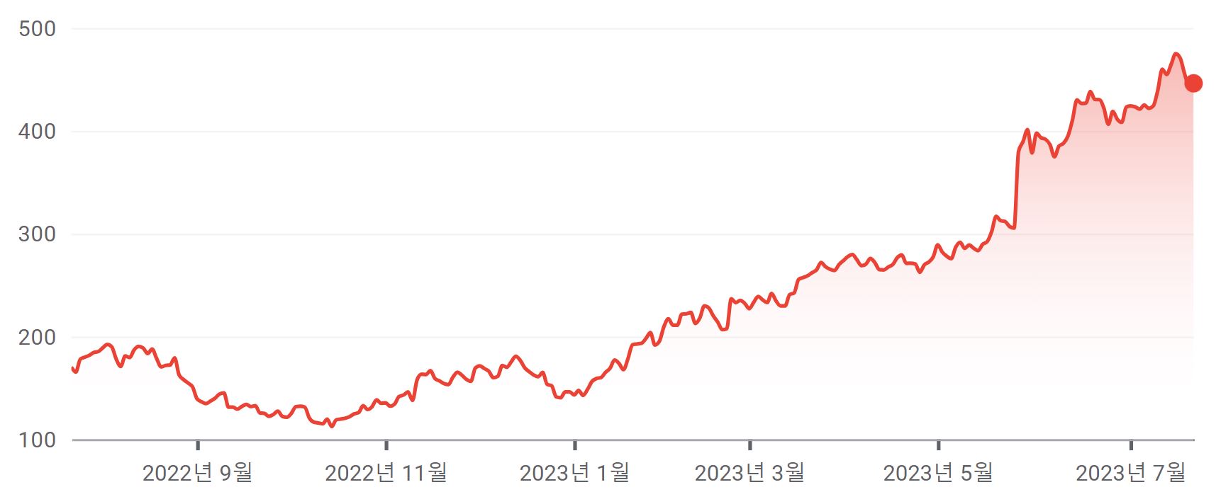 최근 미국 증시는 반도체 업종이 강세다. 올해 들어 미국 반도체 주가를 이끄는 것은 엔비디아로 지난해 10월 120달러까지 떨어졌던 주가가 올해 7월 470달러를 기록해 단 9개월 만에 무려 4배 가까이 올랐다. 미국 반도체 산업 동향을 보여주는 필라델피아 반도체 지수 역시 같은 기간에 2,150에서 3,750으로 1.7배나 올랐다. 나스닥 종합주가지수도 같은 기간에 10,320에서 14,350으로 1.4배 가까이 올랐다.