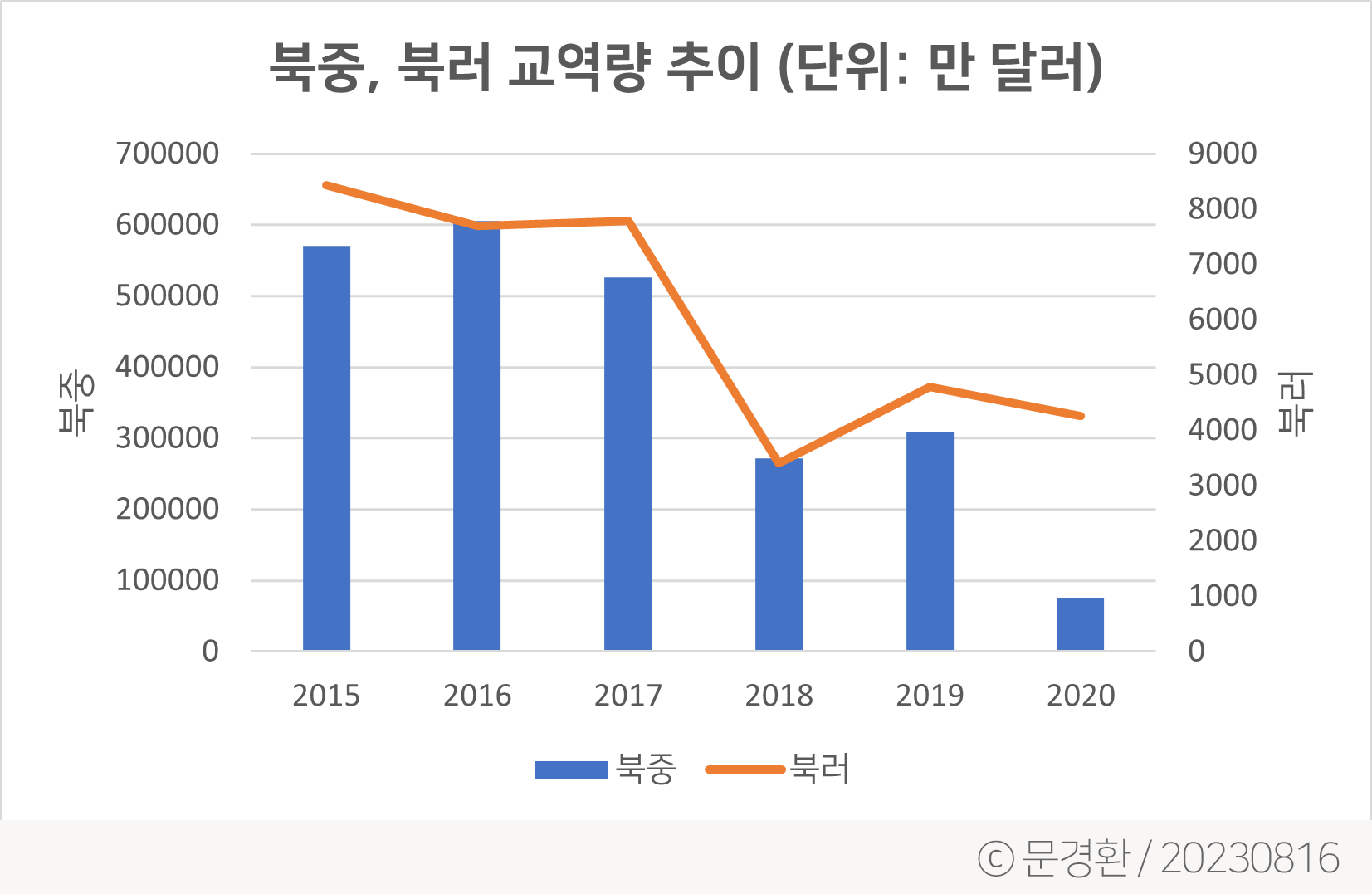 대한무역투자진흥공사(코트라) 자료에 따르면 북중, 북러 연간 교역량 변화는 다음과 같다.