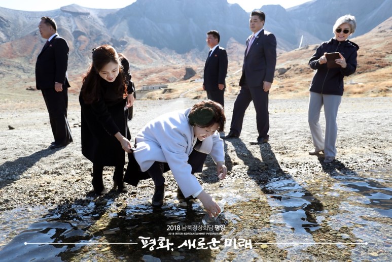 김정숙 여사가 천지 물을 담기 위해 자세를 낮추자 리설주 여사가 옷이 젖지 않도록 재빨리 옷깃을 잡는 장면. 다른 사람을 배려하는 자세가 몸에 배어 있음을 알 수 있다.