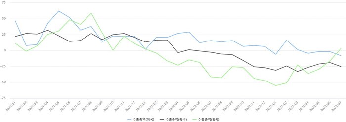 하지만 최근 수출증감률을 보면 대중 수출이 지속해서 감소하는 동안 대미 수출 역시 반짝 급등하다가 뒷걸음질 치고 있다. 최근에는 마이너스 성장률을 기록 중이다.