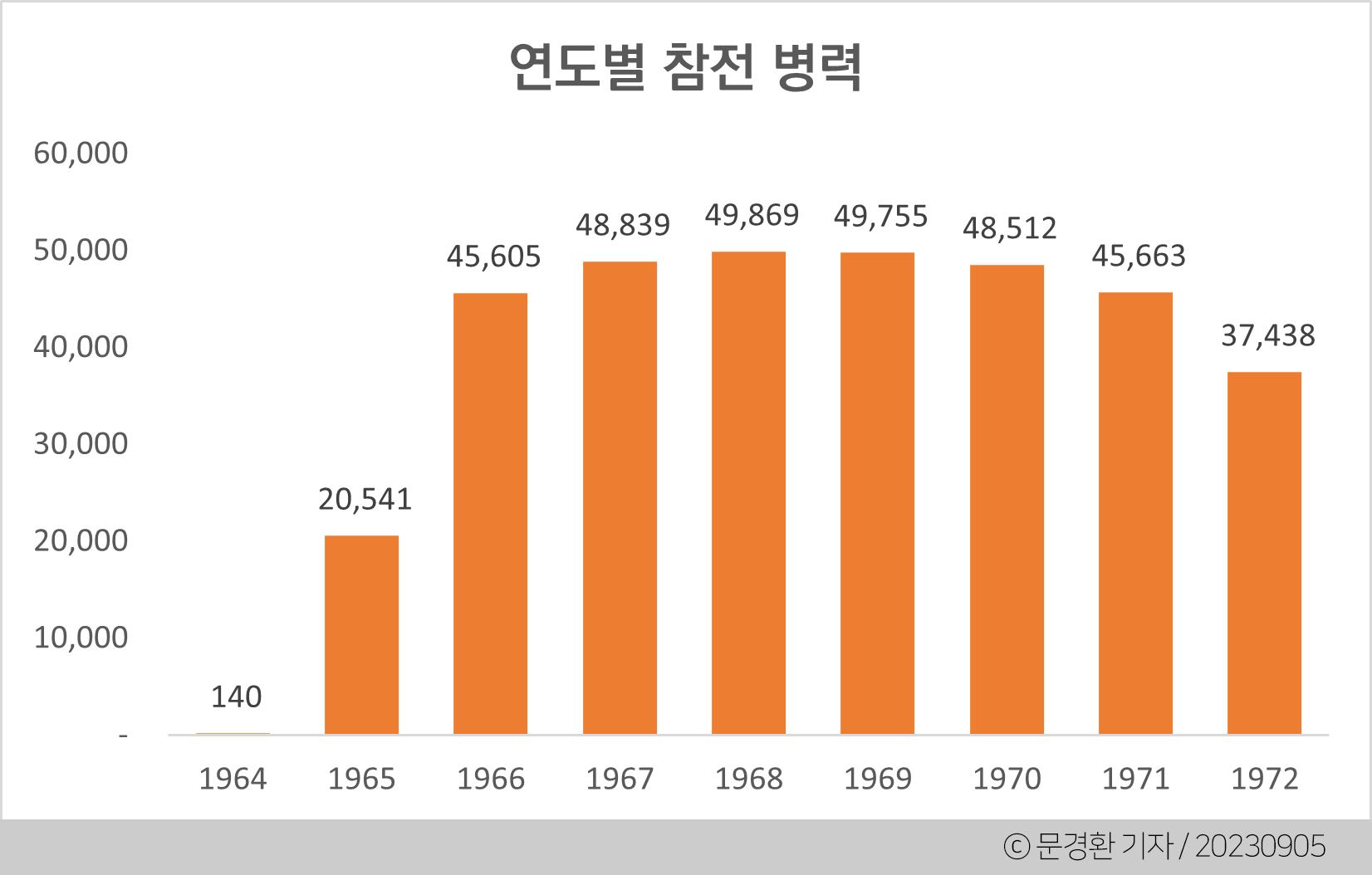 1964년 베트남 전쟁이 발발하자 박정희 정권은 미국의 파병 요구를 수락했다. 1964년 9월 12일 의료진과 태권도 교관이 1차로 베트남에 도착했으며 그 후로도 꾸준히 병력을 파병했다. 한국은 미군 다음으로 많은 병력을 베트남전에 파병한 나라였다. 연도별 참전 병력은 다음과 같다.
