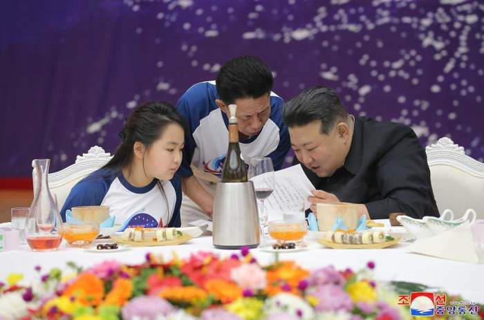 열병식 전날 있었던 기념 연회 사진도 인상적이다. 김정은 국무위원장의 자제가 식탁 중앙에 앉고 김정은 국무위원장과 리설주 여사가 양옆에 앉아있는 구도였다.