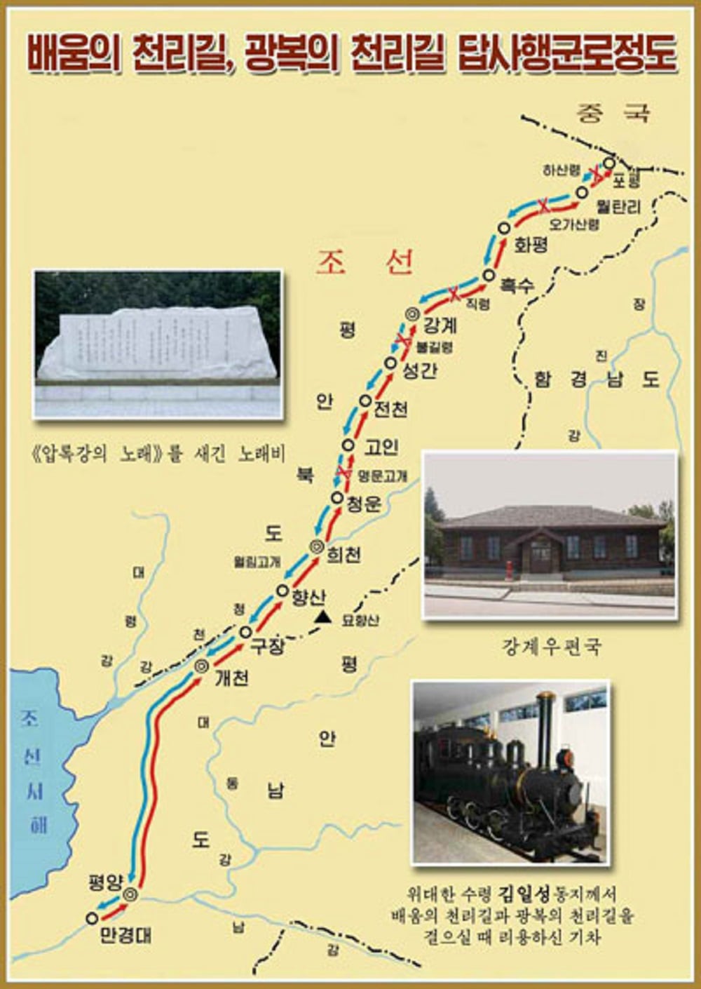 김일성 주석은 10대의 나이에 ‘배움의 천리길’을 걸었다고 한다. 김일성 주석은 12세였던 1923년 3월 16일 “조국의 현실을 알아야 한다”라는 부친의 뜻에 따라 중국 바다오거우(팔도구)에서 압록강을 건너 고향인 평양 만경대를 17일간 홀로 찾아갔다. 이를 북한은 ‘배움의 천리길’이라고 한다. 2년 뒤에는 “조선이 독립하지 않으면 다시 돌아오지 않겠다”라는 각오를 하고 만주로 되돌아갔는데 이를 ‘광복의 천리길’이라 한다. (「[한반도의 오늘] 김일성 ‘배움의 천리길’ 여정 100주년…“50년간 수십만명 답사”」, 연합뉴스, 2023.3.16.)