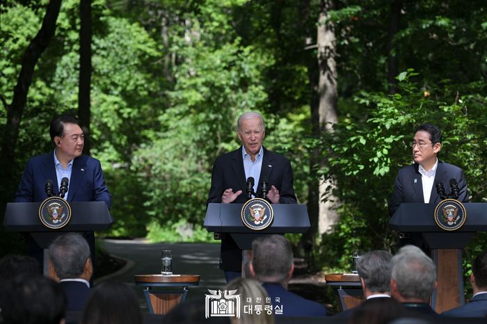 한·미·일은 지난해 8월 18일 미국 워싱턴에서 열린 한·미·일 정상회의에서 ‘캠프 데이비드 정신’을 발표했다. 캠프 데이비드 정신에는 한미동맹과 미일동맹의 전략적 공조 강화, 한·미·일 연합훈련 실시 정례화, 북한 미사일 실시간 공유 등이 담겼다. 한·미·일의 동맹이 준군사동맹 수준으로 올라섰다는 평가가 나온다.