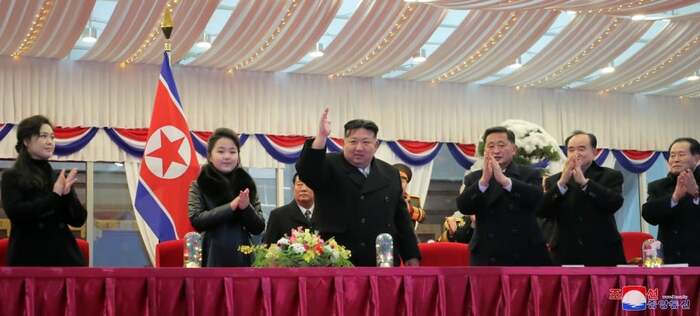 지난 해 12월 31일~새해 1월 1일 열린 북한 신년경축대공연을 관람한 김정은 국무위원장과 자제.