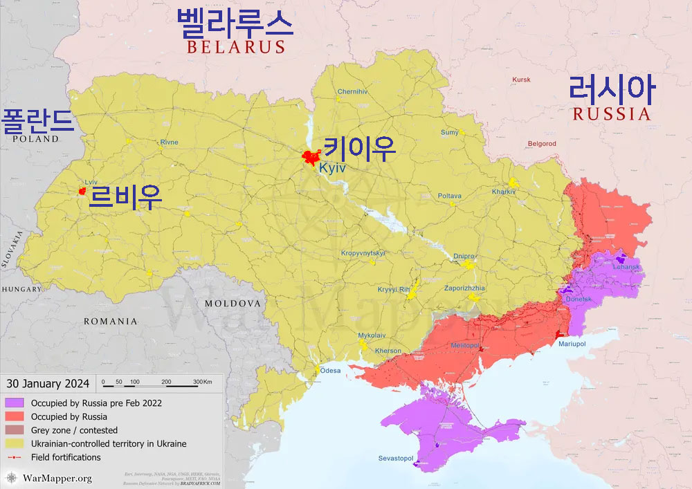 키이우와 르비우 위치. 동쪽의 빨간색, 보라색은 2024년 1월 30일 기준 러시아가 차지한 영토.